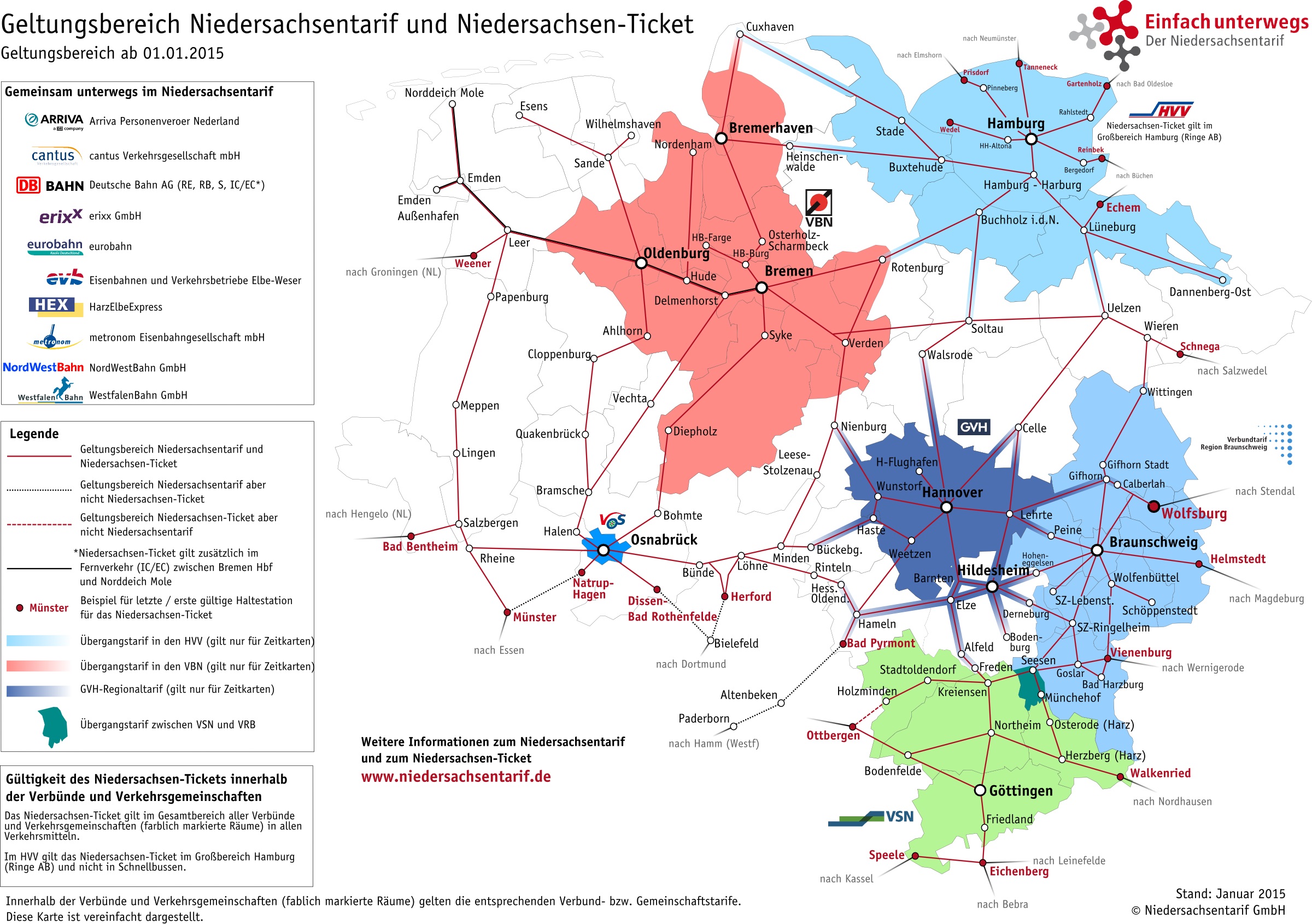 Mit dem Niedersachsen-Ticket kann man einen Tag lang in Niedersachsen, Bremen und Hamburg (HVV Tarifringe A und B) kostengünstig unterwegs sein. Das Niedersachsen-Ticket gilt montags bis freitags ab 9:00 Uhr, Samstag, Sonntag und an Feiertagen bereits von 0:00 Uhr bis 3:00 Uhr des Folgetages. Reisen kann man mit dem Niedersachsen-Ticket in der 2. Klasse der Nahverkehrszüge von DB (IRE, RE, RB und S-Bahn), evb, metronom, NordWestBahn, erixx, arriva, cantus und WestfalenBahn. Bis zu fünf Personen können gemeinsam das Niedersachsen-Ticket nutzen, wobei der Preis sich nach der Anzahl der Reisenden richtet